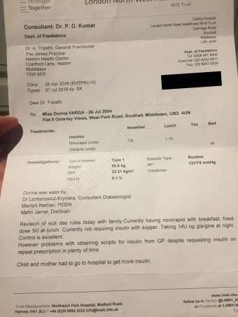 We live in the UK and have been seeing a general practitioner for her diabetes. Some time after my daughter’s diagnosis, the doctor stopped prescribing insulin refills. We kept requesting the refill but were refused, and we ran out. I had to take my daughter to the hospital, where we had to wait several hours for a refill.